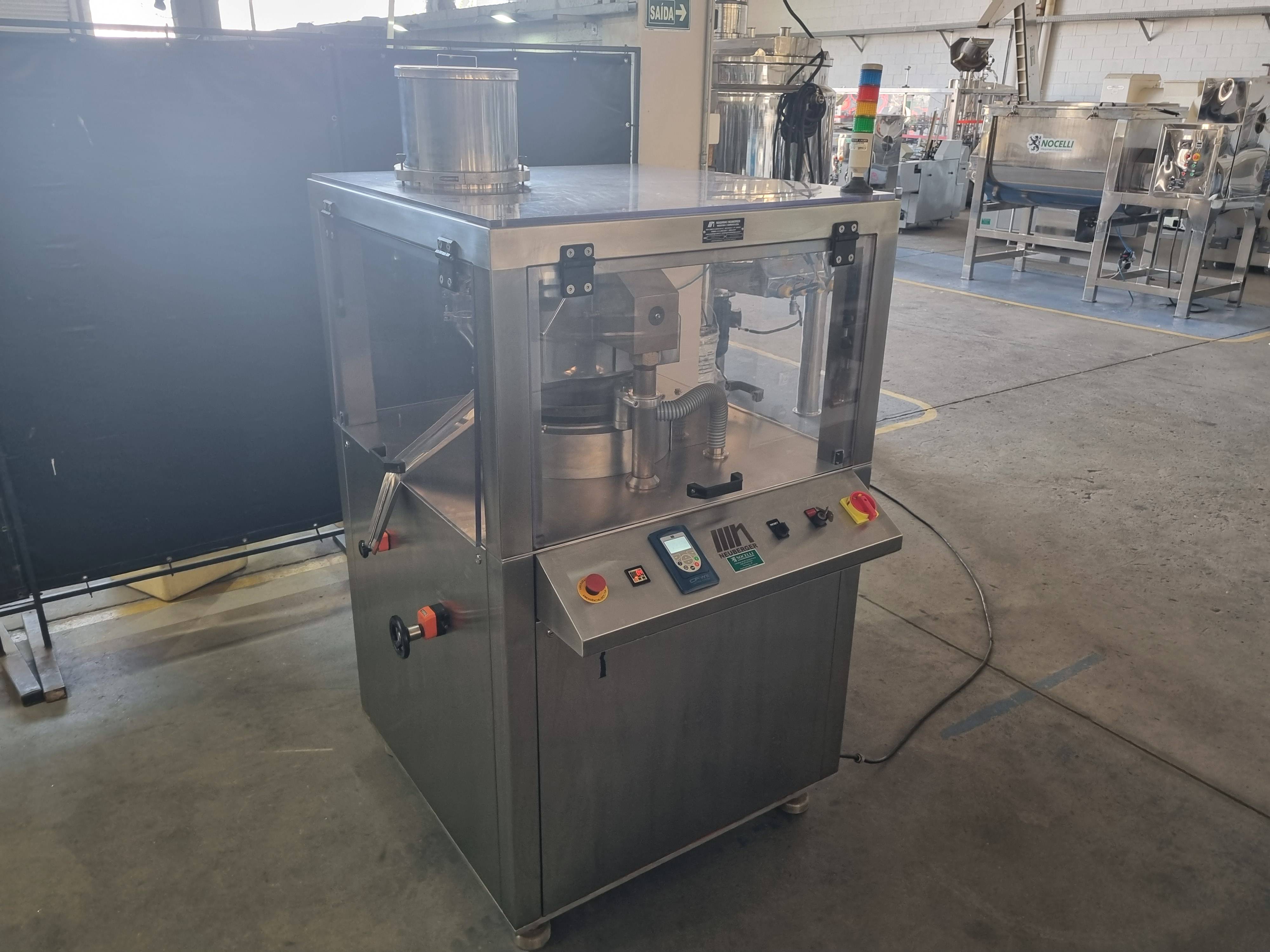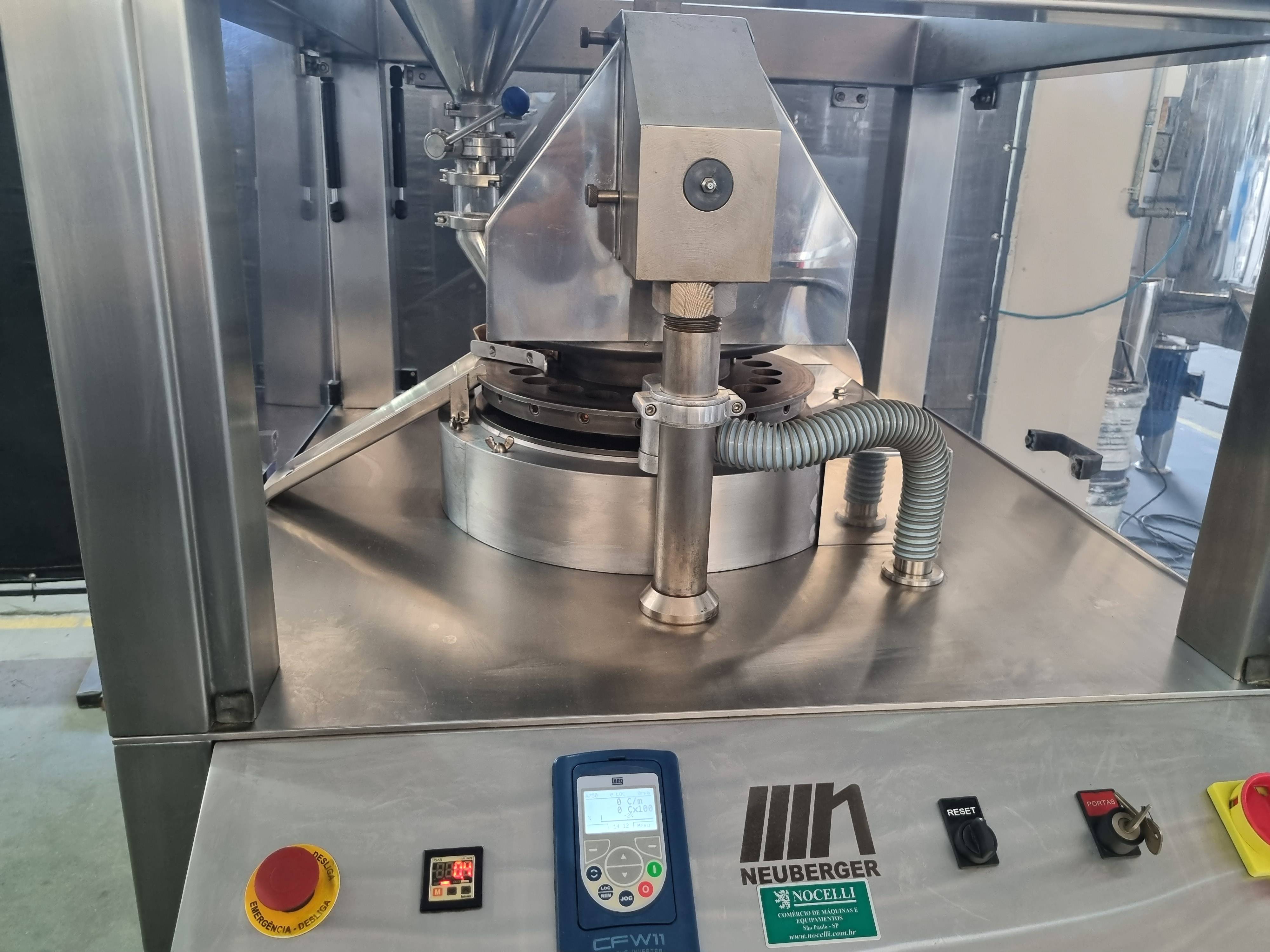 Compressora automática Tipo : Rotativa Punções: 20 Marca: Neuberguer Modelo : MN-20F – tipo D Caracteristicas: com inversor de frequência , 220v trifásico , encabinada . ano 2022 , com aspirador de pó marca Neuberguer modelo ASP200 max Produção :até 900 ciclos / min Compressora automatica rotativa , com 20 punções , marca Neuberguer modelo MN-20F - Tipo D , com inversor de frequência , 220v trifásico , encabinada . ano 2022, com aspirador de pó marca Neuberguer modelo ASP200 max , produção até 900 ciclos / min .A compressora rotativa é uma máquina para industria e serve para comprimir materiais em drágeas. Utilizam força de compressão para oferecer um controle na dosagem dos pós e da espessura dos comprimidos.
