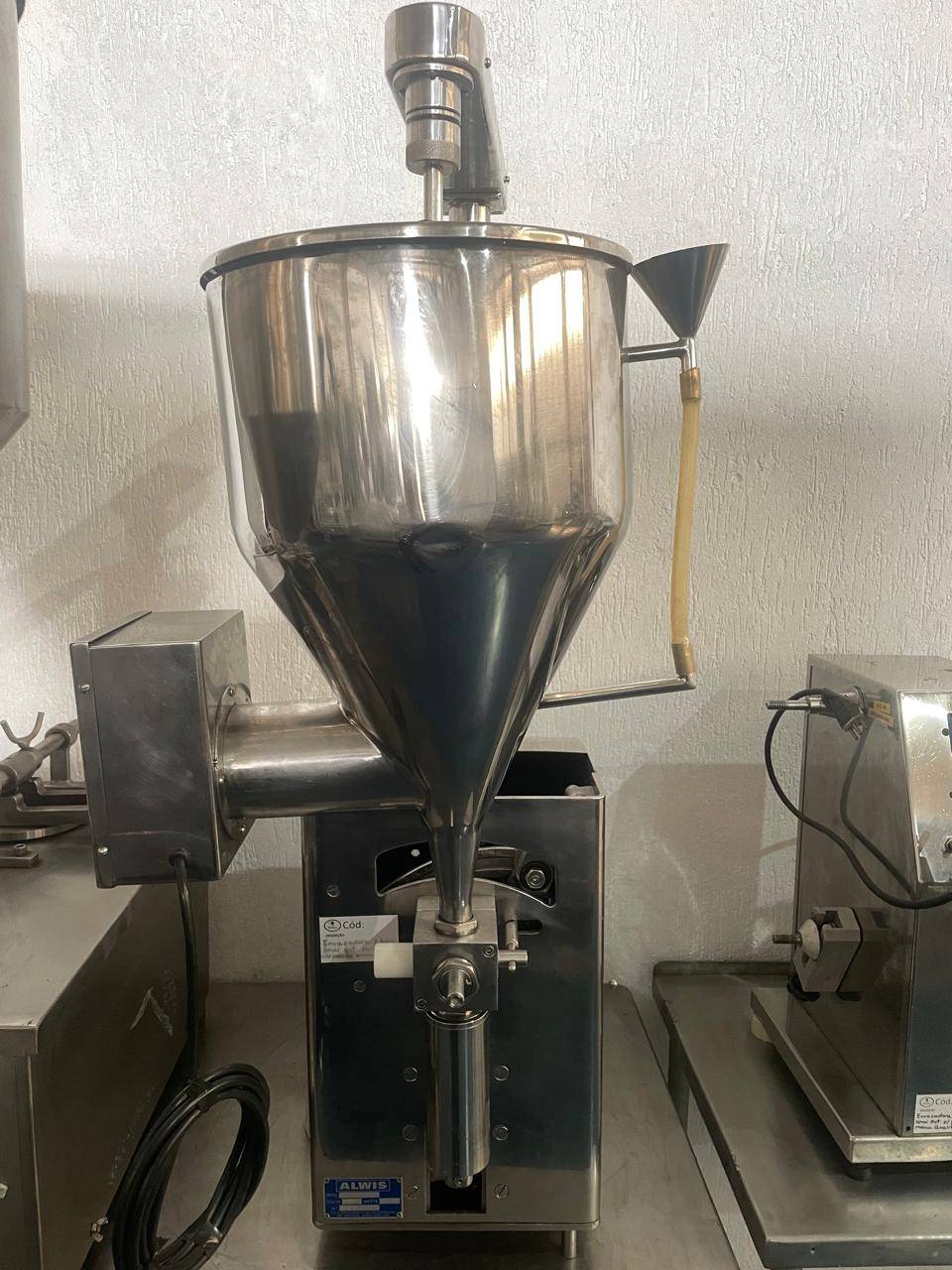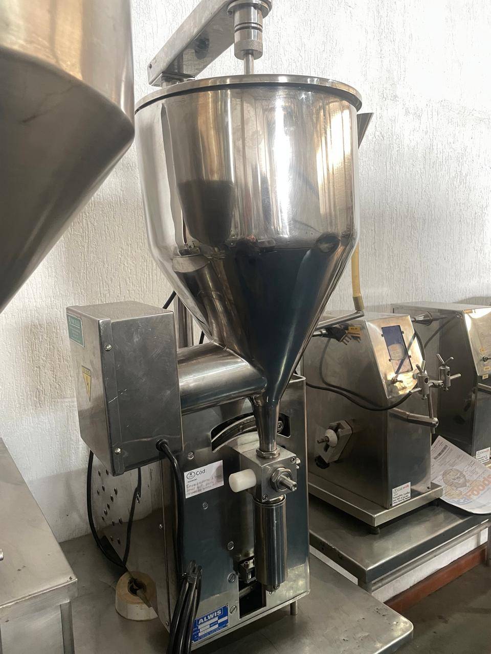Envasadora semi automática Bico : 1 bico Sistema : gravidade Produto: Cremosos Marca: Alwis Produção : de até 1500 und/h Caracteristicas: com tacho encamisado Envasadora 1 bico semi automática sistema gravidade marca Alwis para produtos cremosos com tacho encamisado - produção de até 1500 unid/h