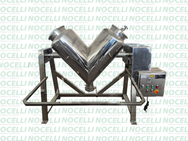 Misturador em V em aço inox 316 (contato com o produto) para produto em pó e granulado com inversor de Frequencia . Motor 220V/380V / 60Hz – Trifasico Modelo Capacidade Potência NMV200 200 L 1,5 CV NMV500 500 L 4 CV Misturador em V é usado para misturar grãos e pós de material seco nas áreas Farmacêutica, cosmética, química e alimentícia.