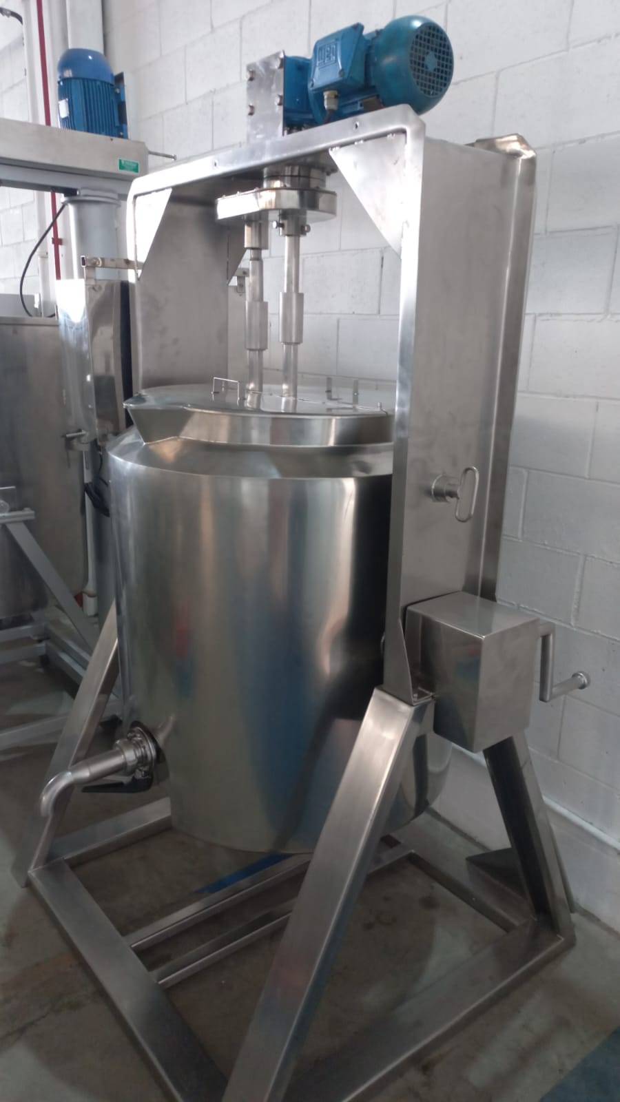 Tanque com Misturador planetário, em aço inox (Batedeira) de 250-lts. Velocidade de rotação controlada por inversor de frequência. Tanque com registro de saída para os produtos líquidos, ou basculante com bica para remover o produto cremosos.