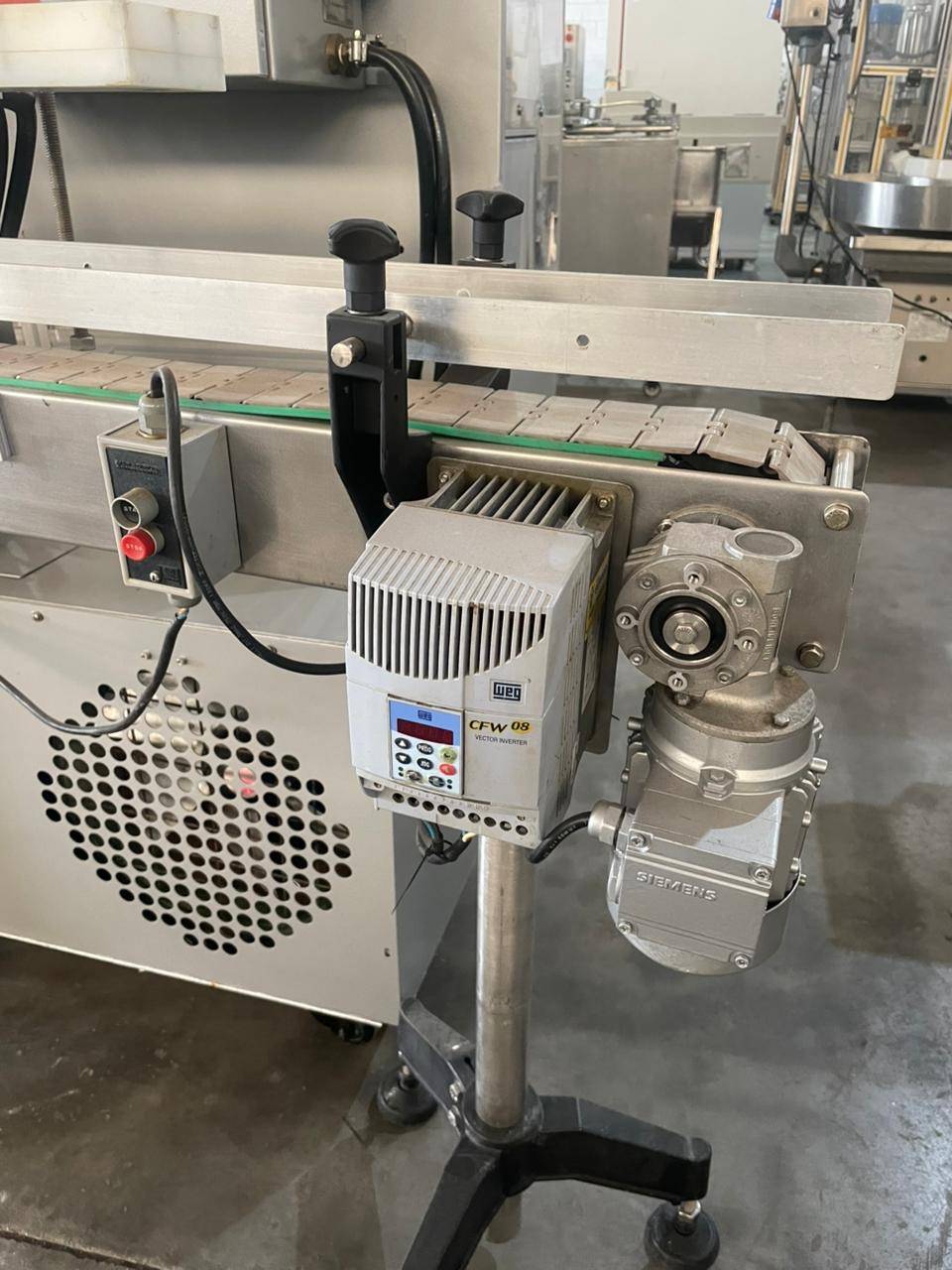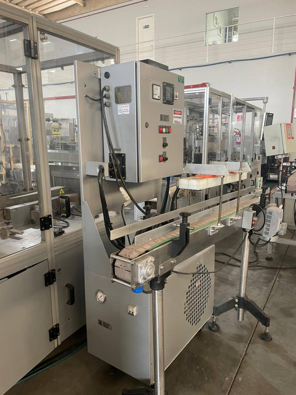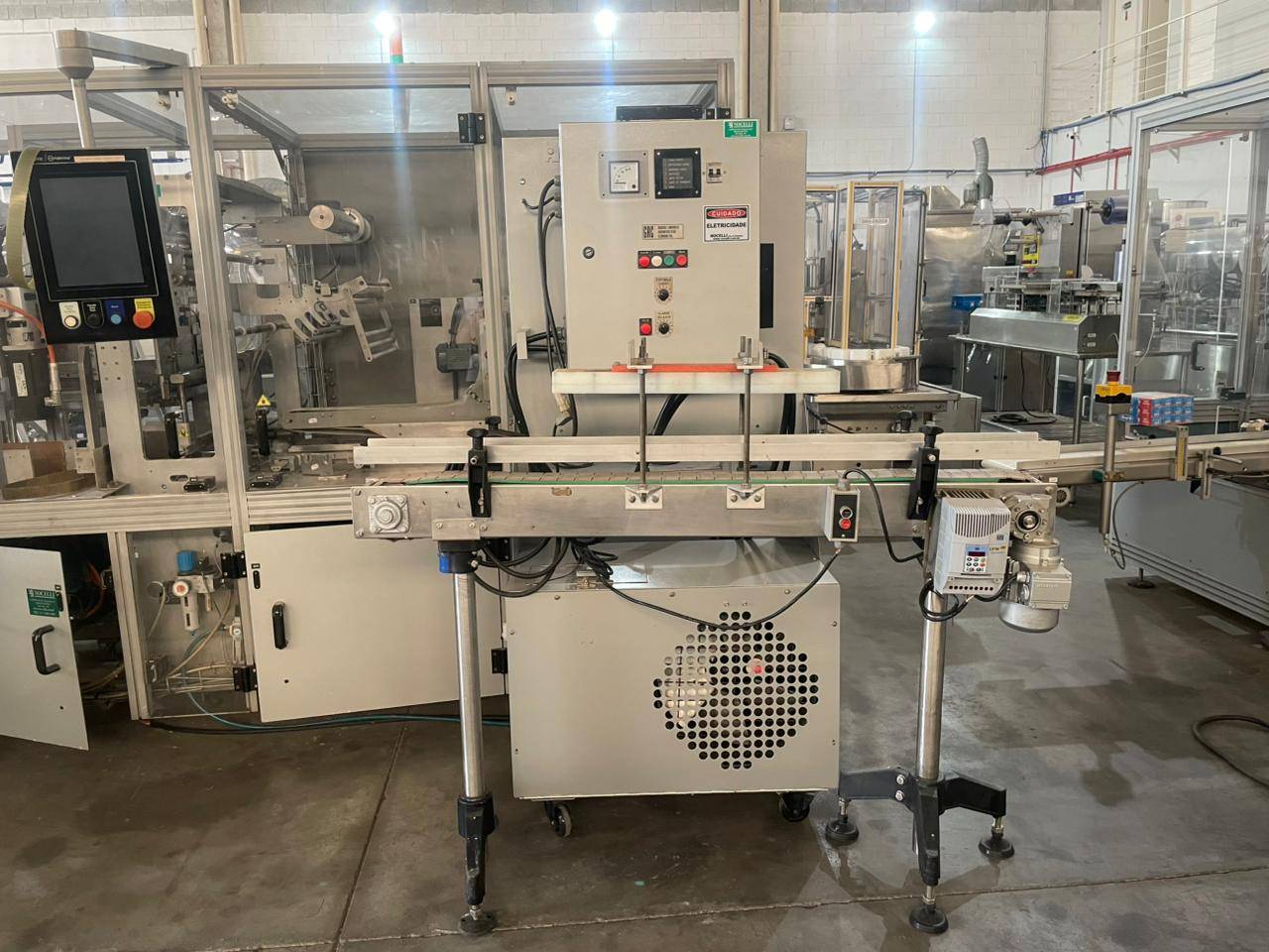Seladora automática Sistema: indução Tipo de selagem: por indução Marca: GRC Produção: de até 10.000 frascos/ H Potência motor: 2 kw OBS: Para selagens de frascos e potes com lacre de alumínio, com refrigeração automática Seladora automática por indução marca GRC para selagem de frascos e pote com lacre de aluminio, com refrigeração automatica - produção de até 10.000 frascos/h